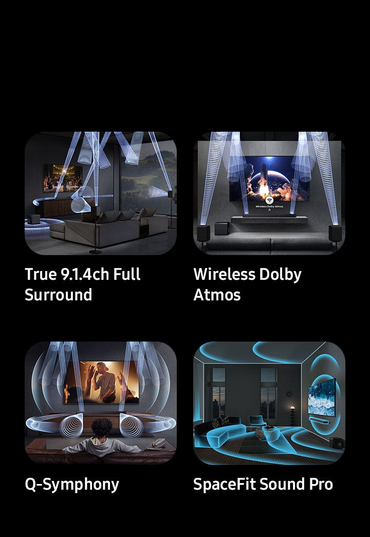• 標誌性功能:無線杜比全景聲 (Dolby Atmos)、Q-Symphony 音效、SpaceFit Sound Pro、AI 音效優化、多種音效模式